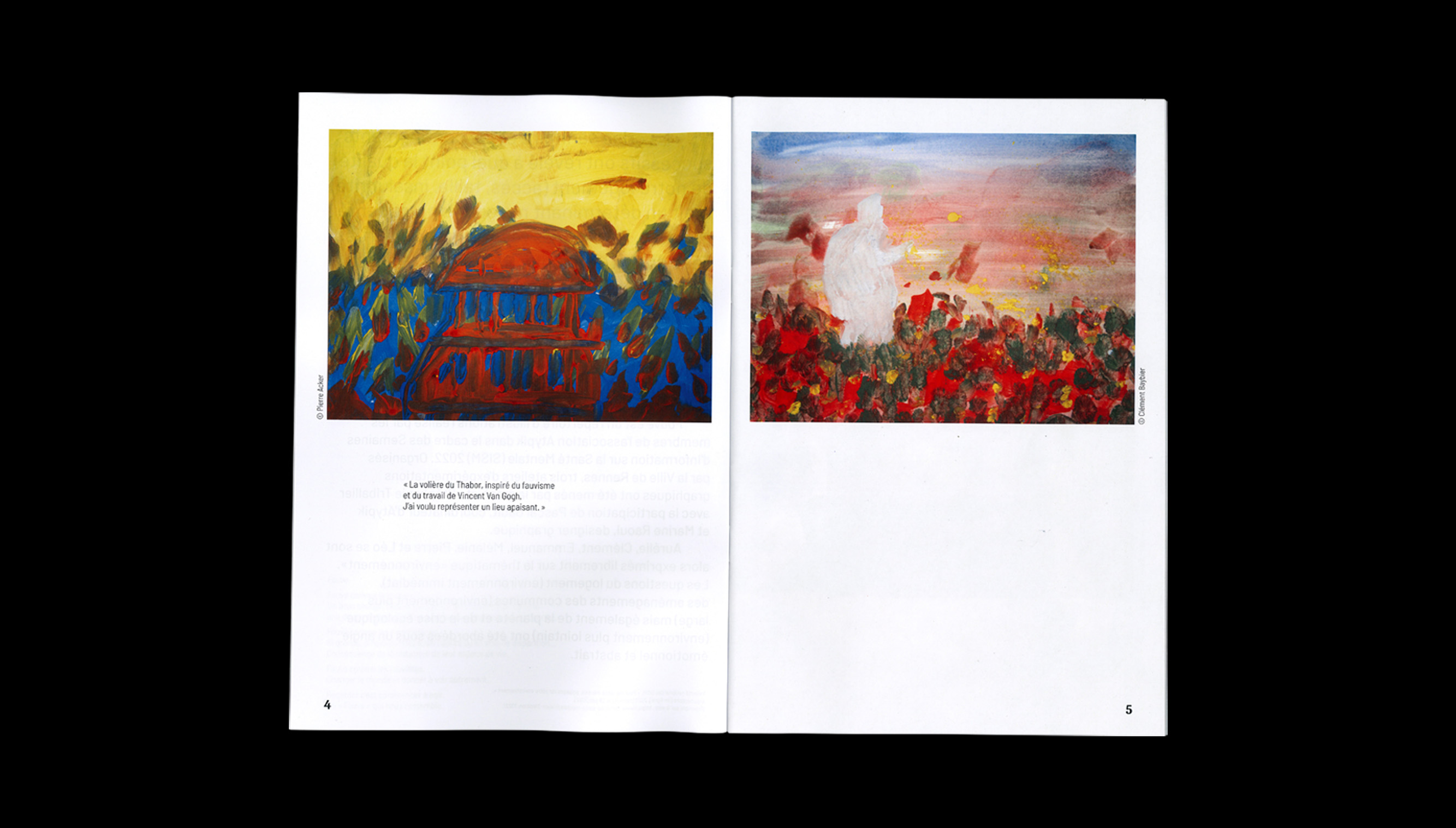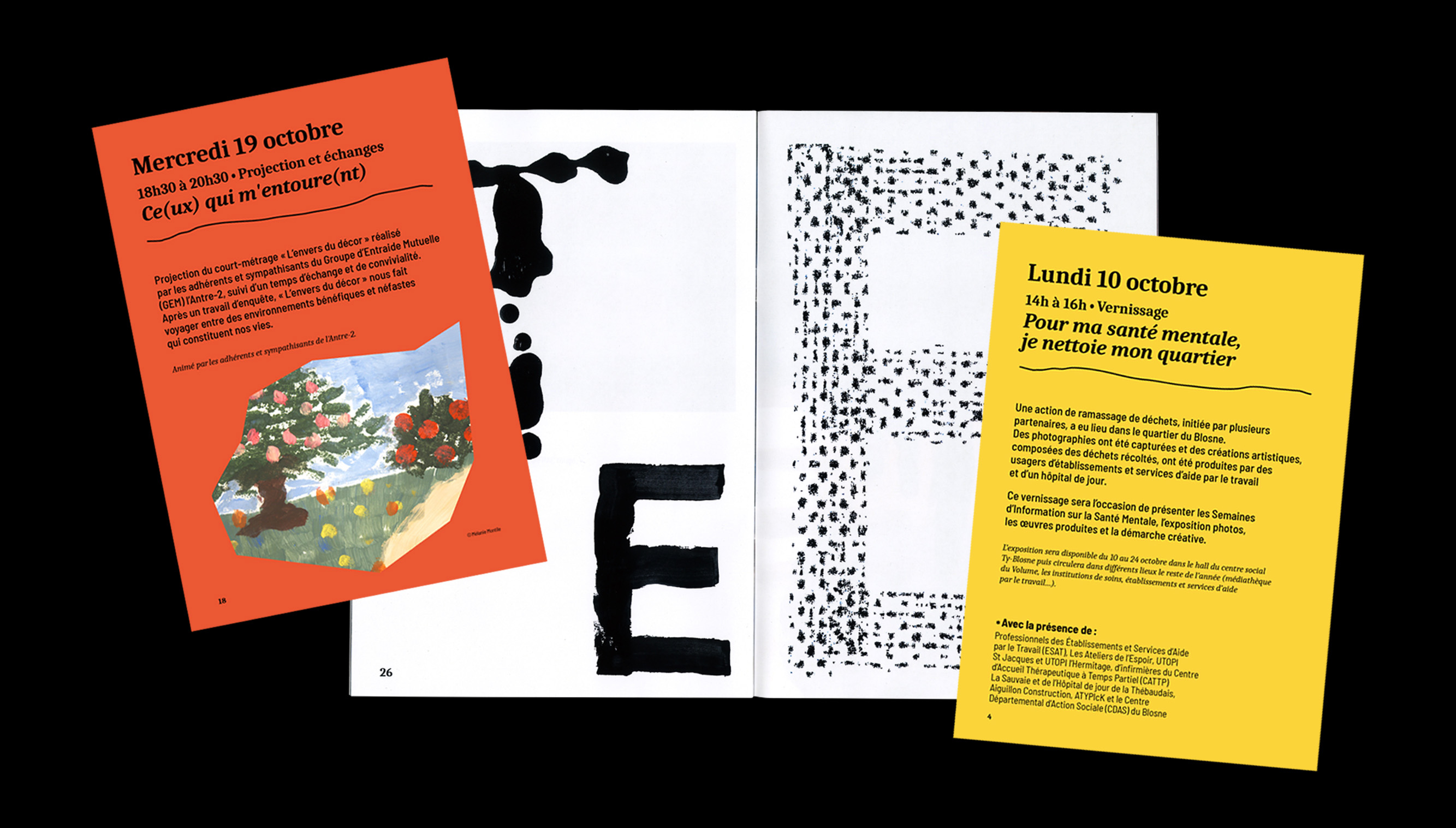Trois ateliers d’expérimentations graphiques ont été menés par la graphiste Stéphanie Triballier avec la participation de Pascal Gault, coordinateur d’ATYPIcK et moi-même. Aurélie, Clément, Emmanuel, Mélanie, Pierre et Léo se sont alors exprimés librement sur la thématique de l’environnement. Les questions du logement (environnement immédiat), des aménagements des communes (environnement plus large) mais également de la planète et de la crise écologique (environnement plus lointain) ont été abordées sous un angle émotionnel et abstrait. Les productions ont ensuite été regroupées et valorisées dans un ouvrage commun dont le nom a été déterminé par les participants : « Fauve ».