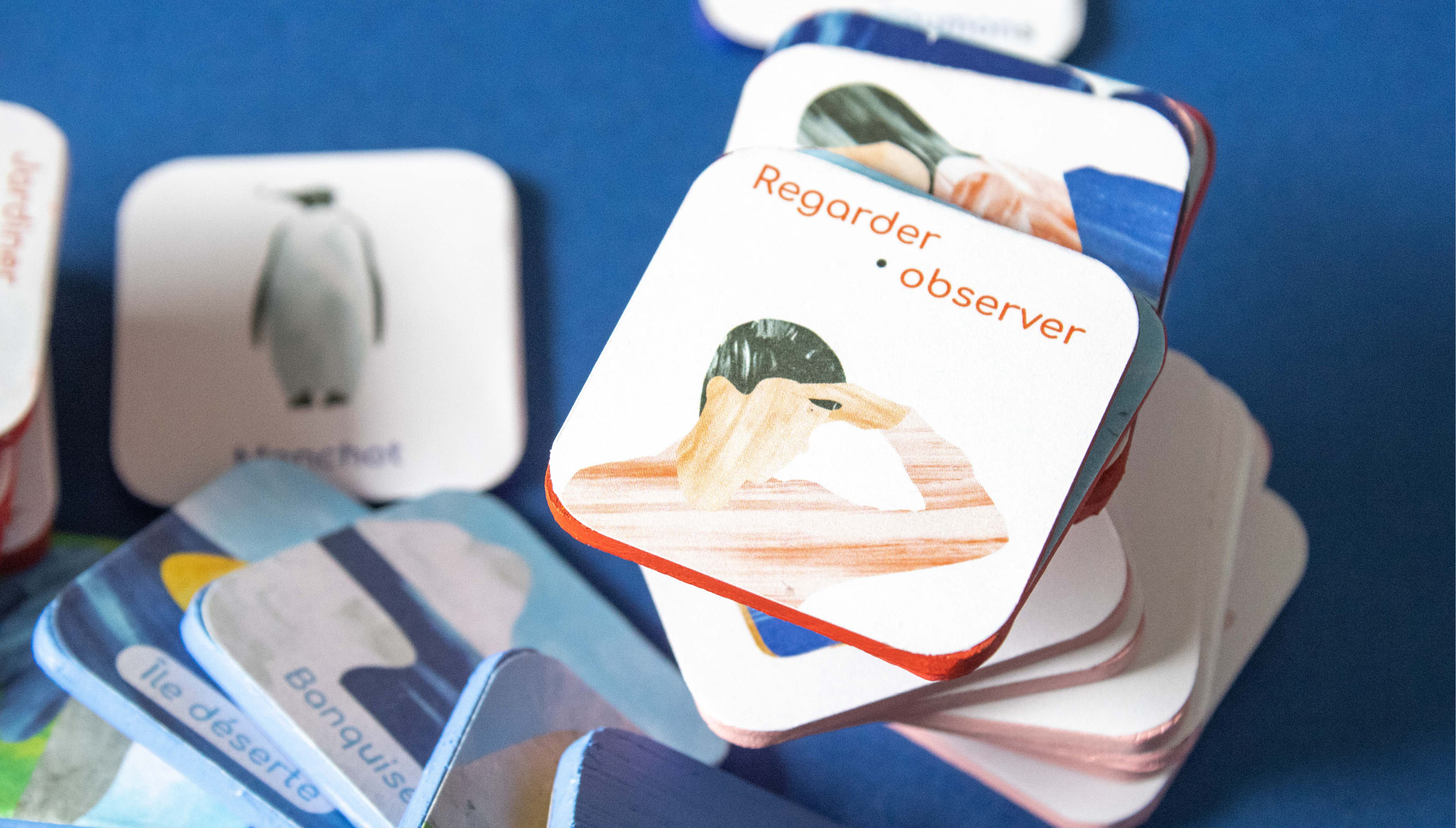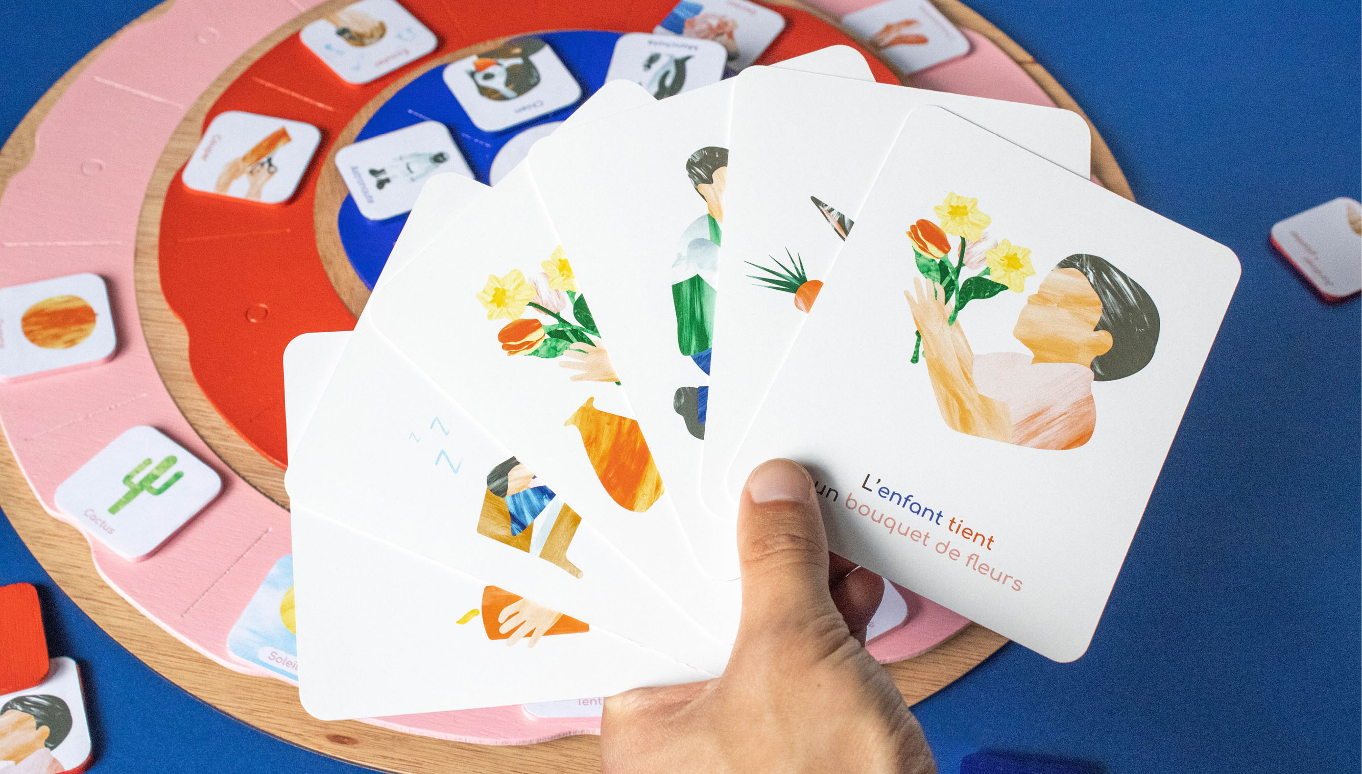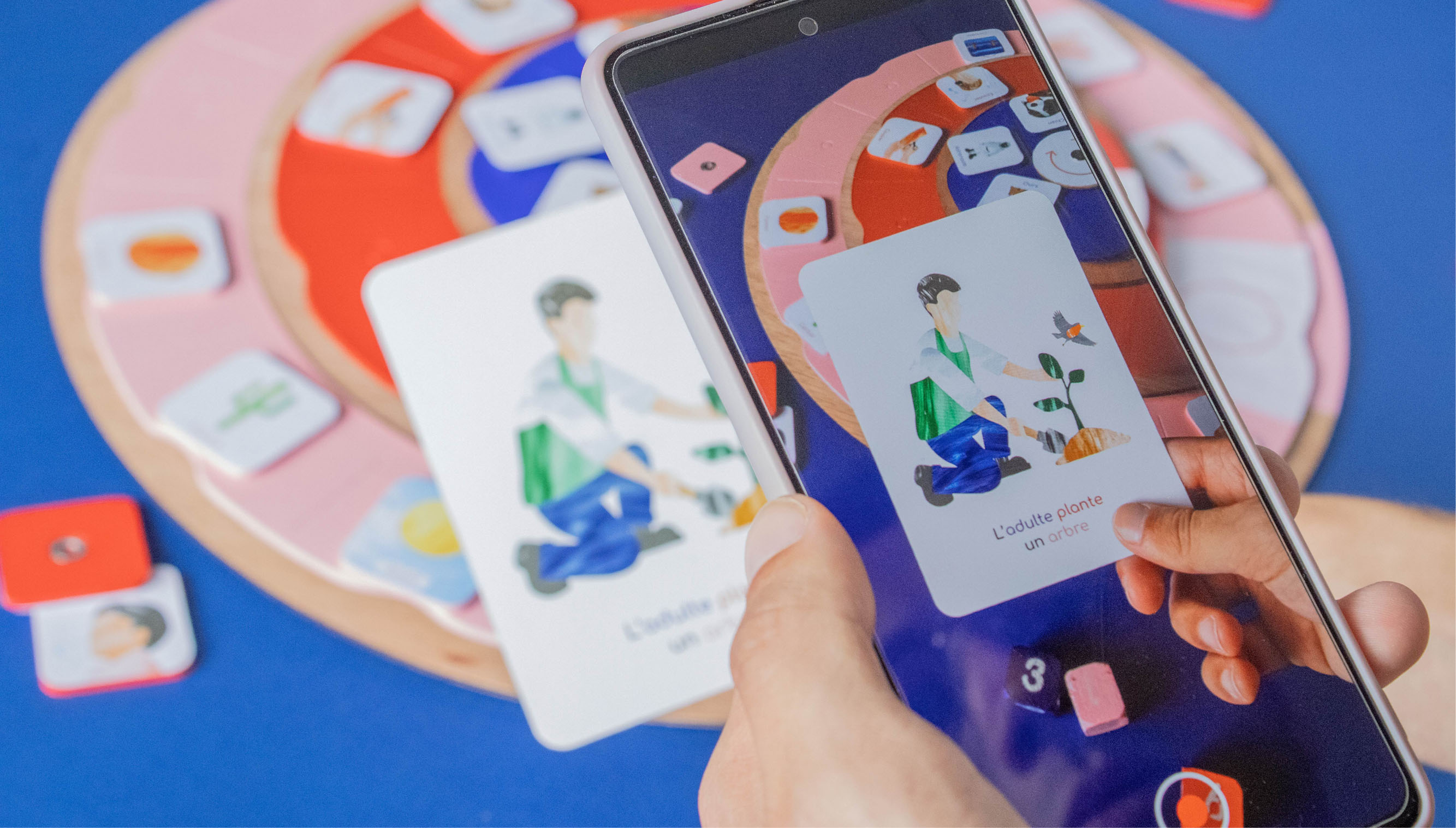Le plateau circulaire encourage l’enfant à créer des phrases logiques mais aussi fantaisistes grâce à la multiplicité de combinaisons. Pour complexifier le jeu, des cartes actions peuvent être ajoutées. Elles représentent visuellement des combinaisons de pièces à jouer et peuvent être gagnées par l’enfant lors d’une partie lorsque celui-ci les aligne. En plus de représenter une action en 2D, ces dernières permettent également à l’enfant de les visualiser animées grâce à l’application Artivive.
