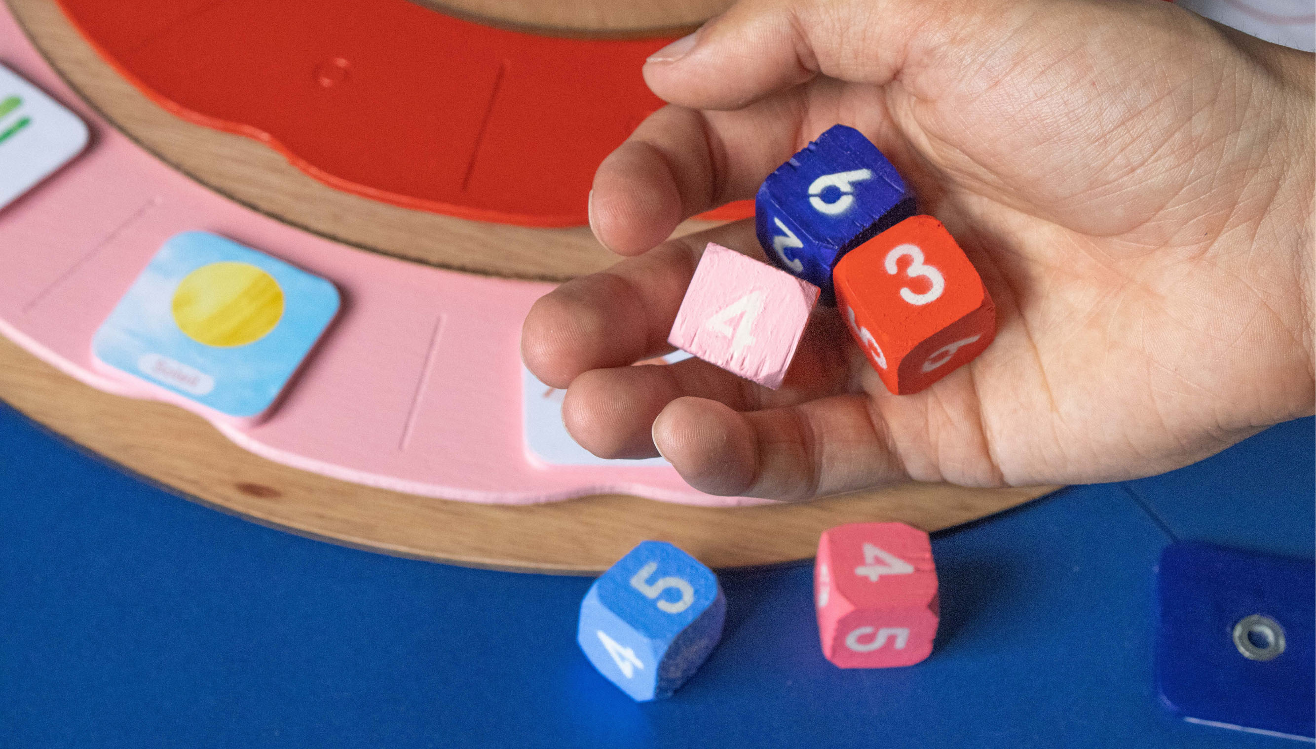 Il permet d’aider l’enfant TDL à construire des phrases simples et des phrases complexes tout en lui permettant de comprendre le sens d’un récit. La roue des phrases simples est composée de trois cercles : le cercle des objets animés, les verbes d’action et les objets inanimés. La roue des compléments où figurent les temps et les lieux peut être rajoutée en fonction du niveau et du degré de sévérité du trouble de l’enfant. Pour commencer une partie, l’ensemble des pièces sont placées sur les cercles. L’enfant va ensuite lancer les trois dés de la phrase simple en même temps (ou non) puis va tourner les cercles de plusieurs crans en fonction des chiffres donnés, alignant ainsi plusieurs images qui produisent ensemble une phrase.