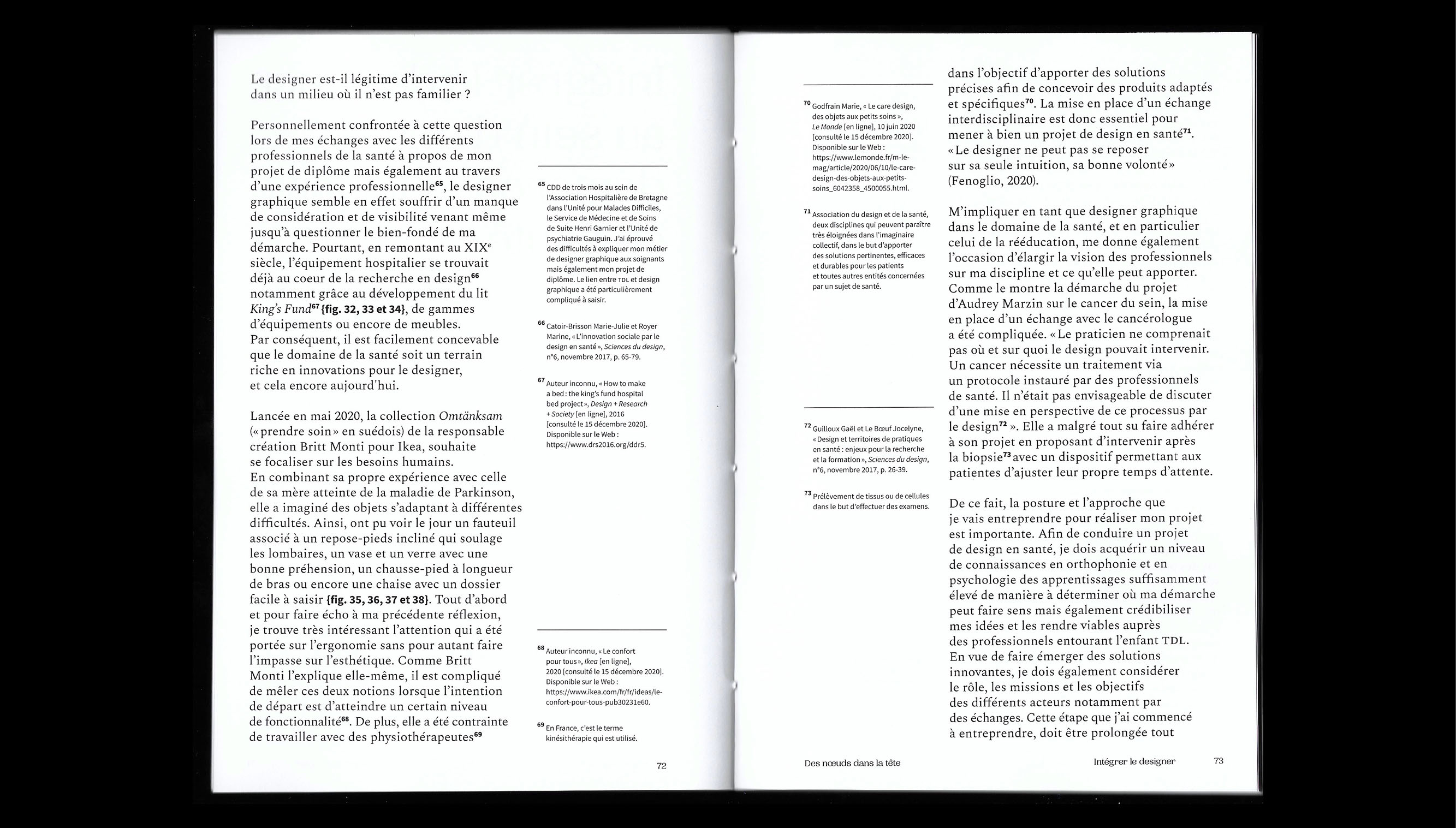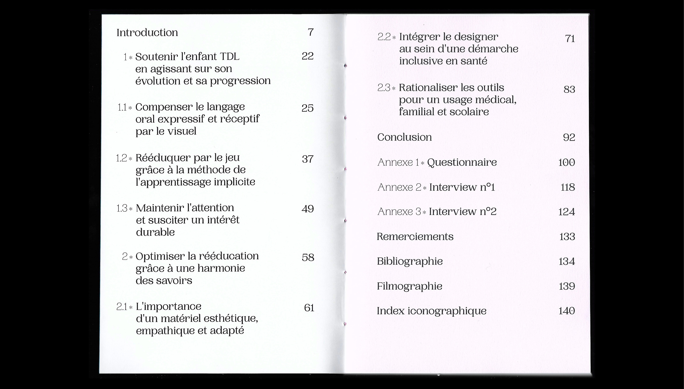 Ce travail de plusieurs mois se divise en deux axes : l’apport du design graphique dans l’évolution et la progression de l’enfant TDL ainsi que la nécessité d’harmoniser les savoirs des différents acteurs l’entourant. Tout au long de ce mémoire, les réflexions apportées sont soutenues par une revue littéraire de l’existant, des échanges avec de nombreux professionnels de santé, un questionnaire à destination des parents et une iconographie issue de plusieurs champs du design.
