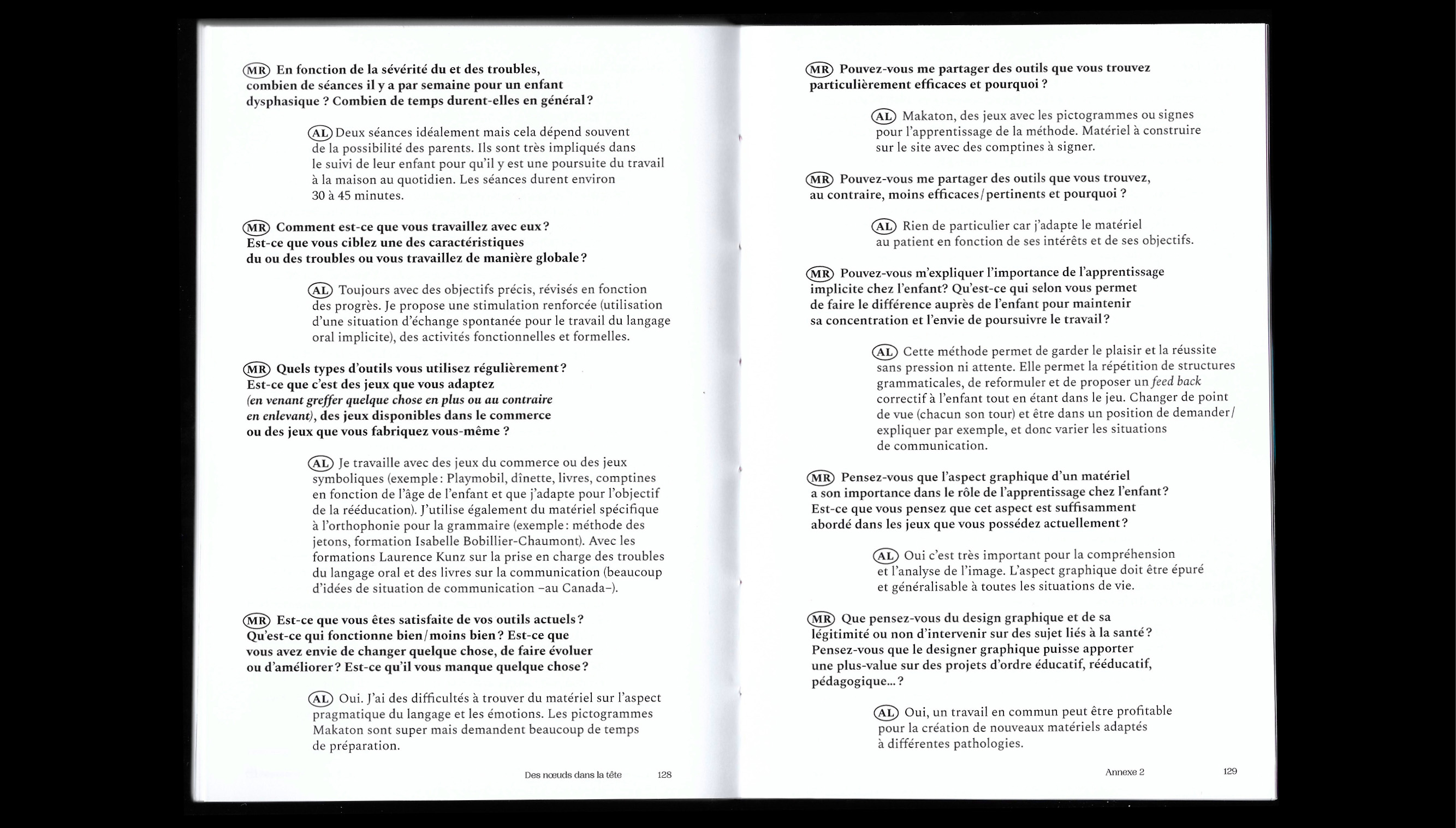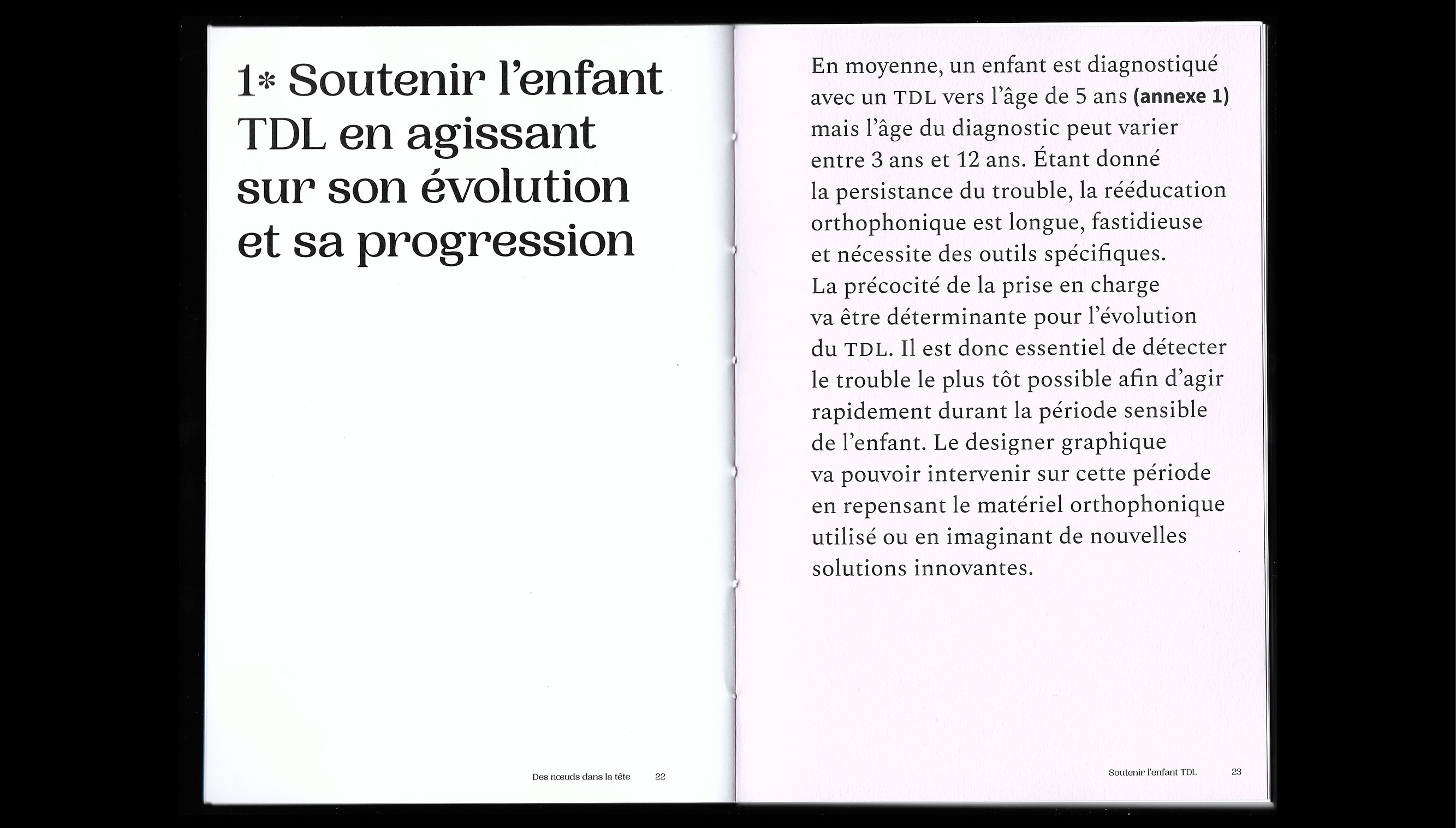 Des nœuds dans la tête est un travail de recherche théorique visant la compréhension des problématiques rencontrées par un enfant ayant un trouble développemental du langage (TDL) afin d’imaginer des solutions adaptées par le design graphique.