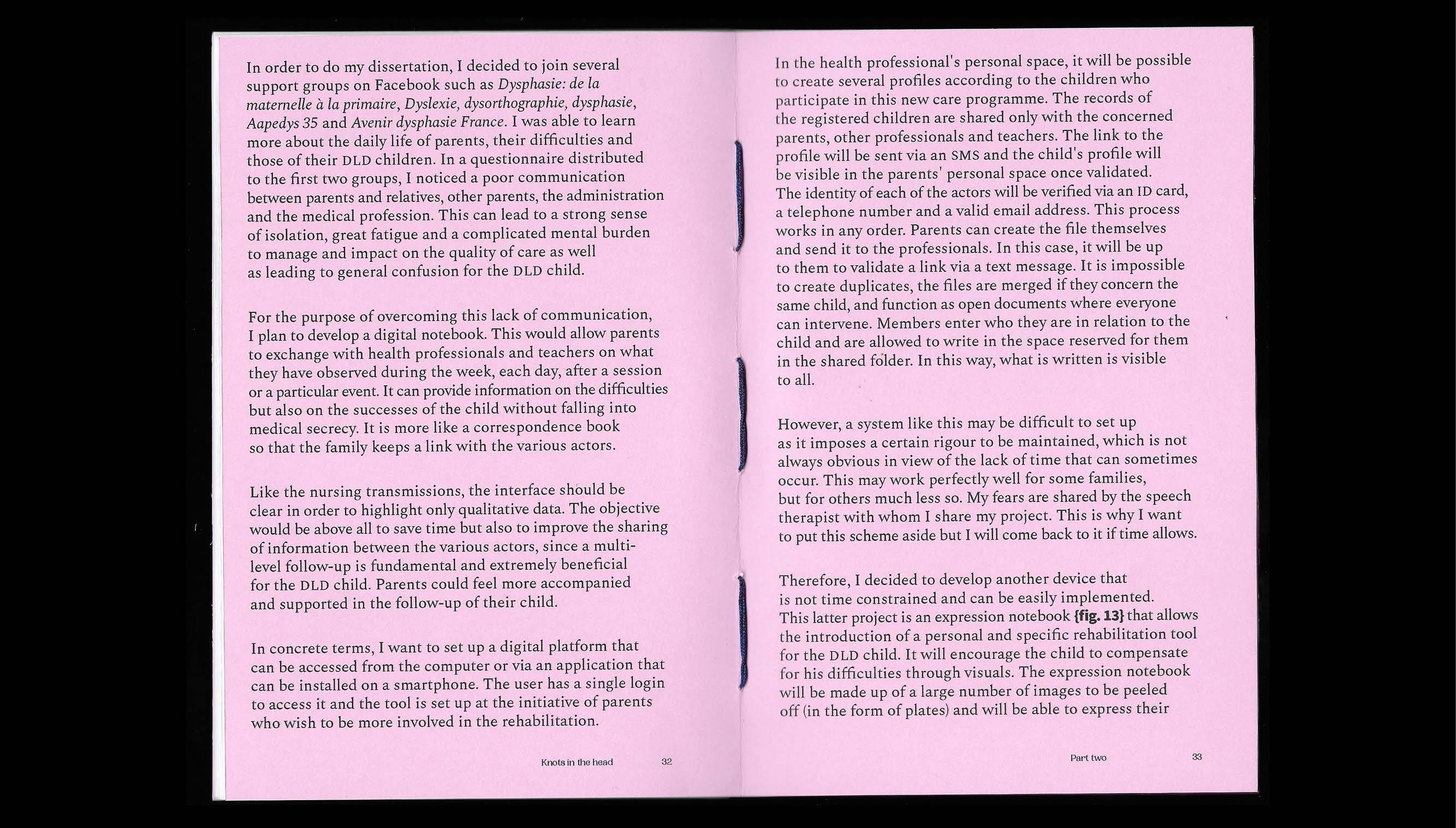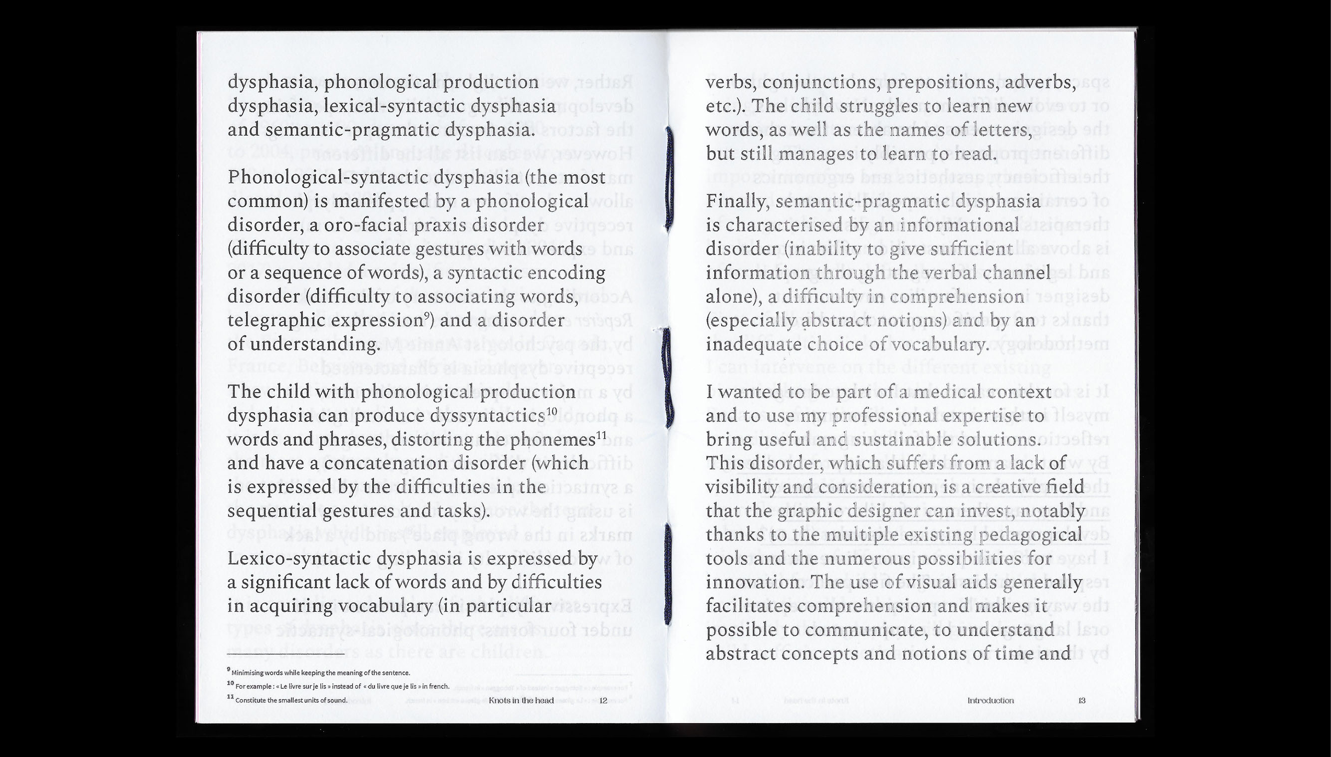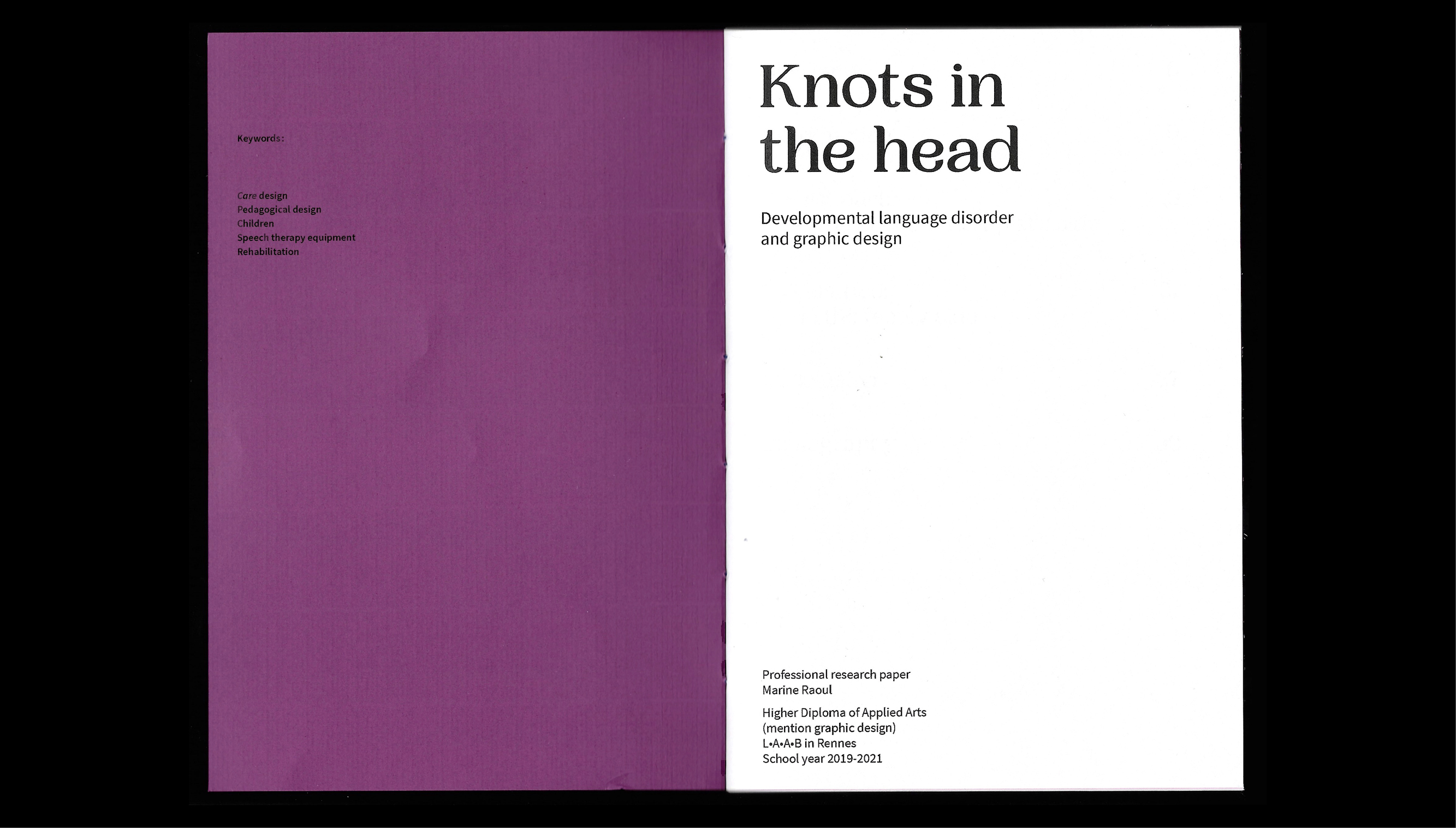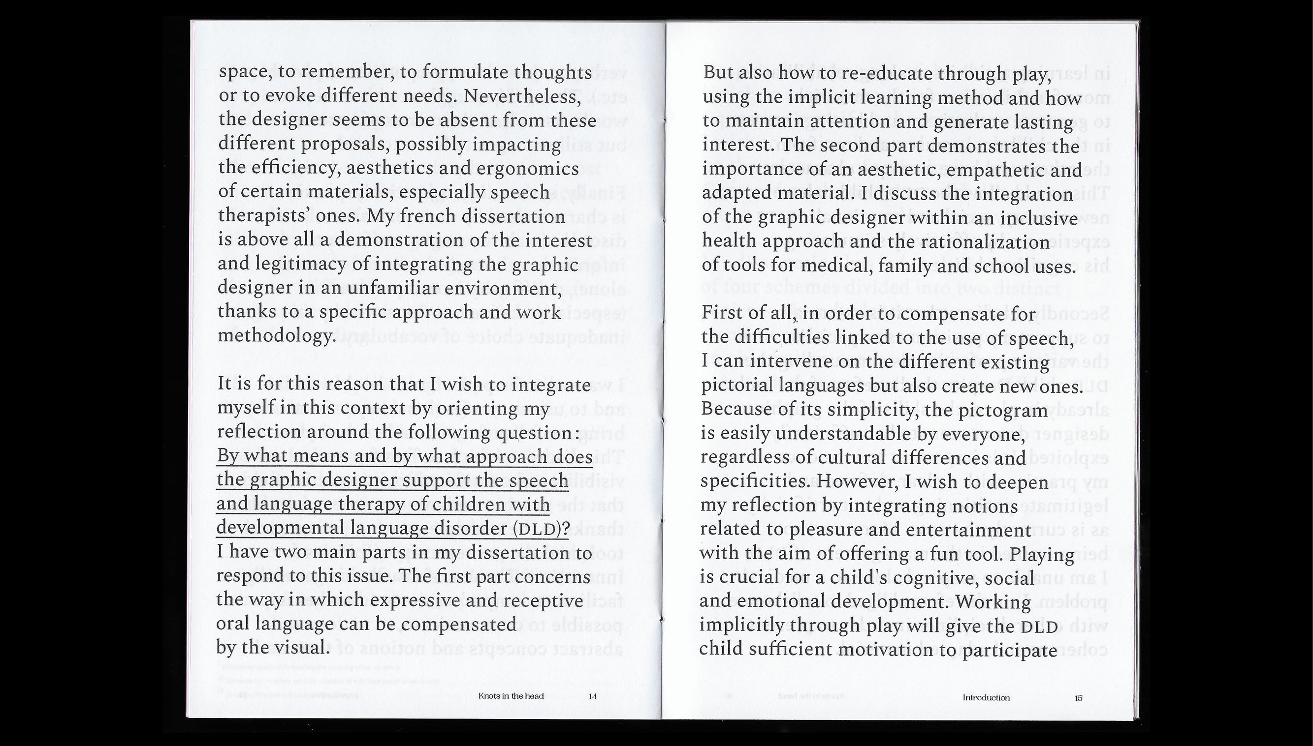 Intrinsèquement lié au travail de recherche autour du trouble développemental du langage (TDL), Knots in the head est une micro-édition rédigée en anglais visant à démontrer l’importance de la pratique du designer graphique dans l’élaboration de solutions adaptées à l’enfant TDL.