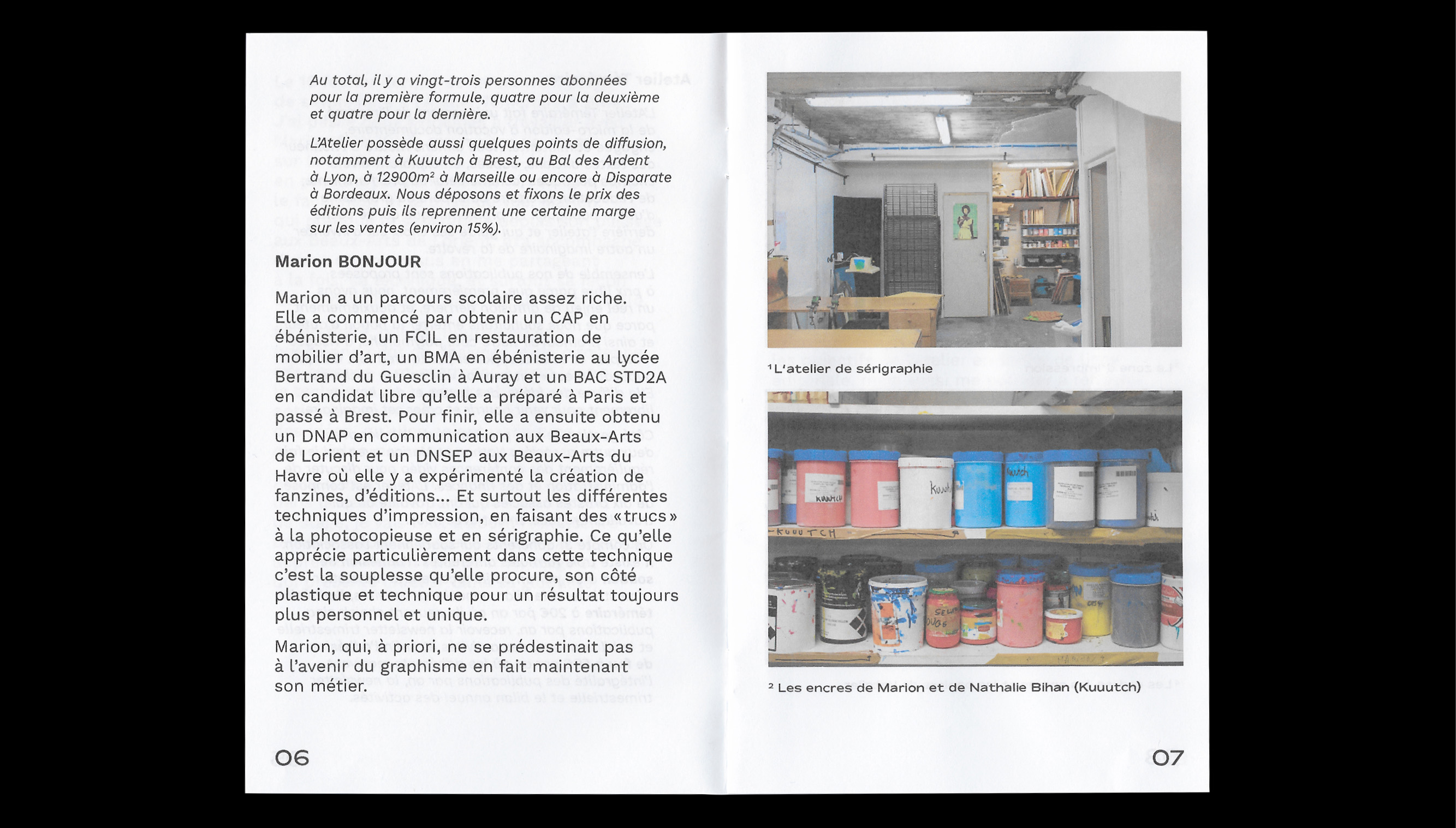 Résultant d’une expérience professionnelle auprès de Marion Bonjour (Atelier Téméraire à Brest), cette micro-édition aborde la thématique de la sérigraphie et de son aptitude à diffuser librement des idées politico-sociales au sein de l’espace public.